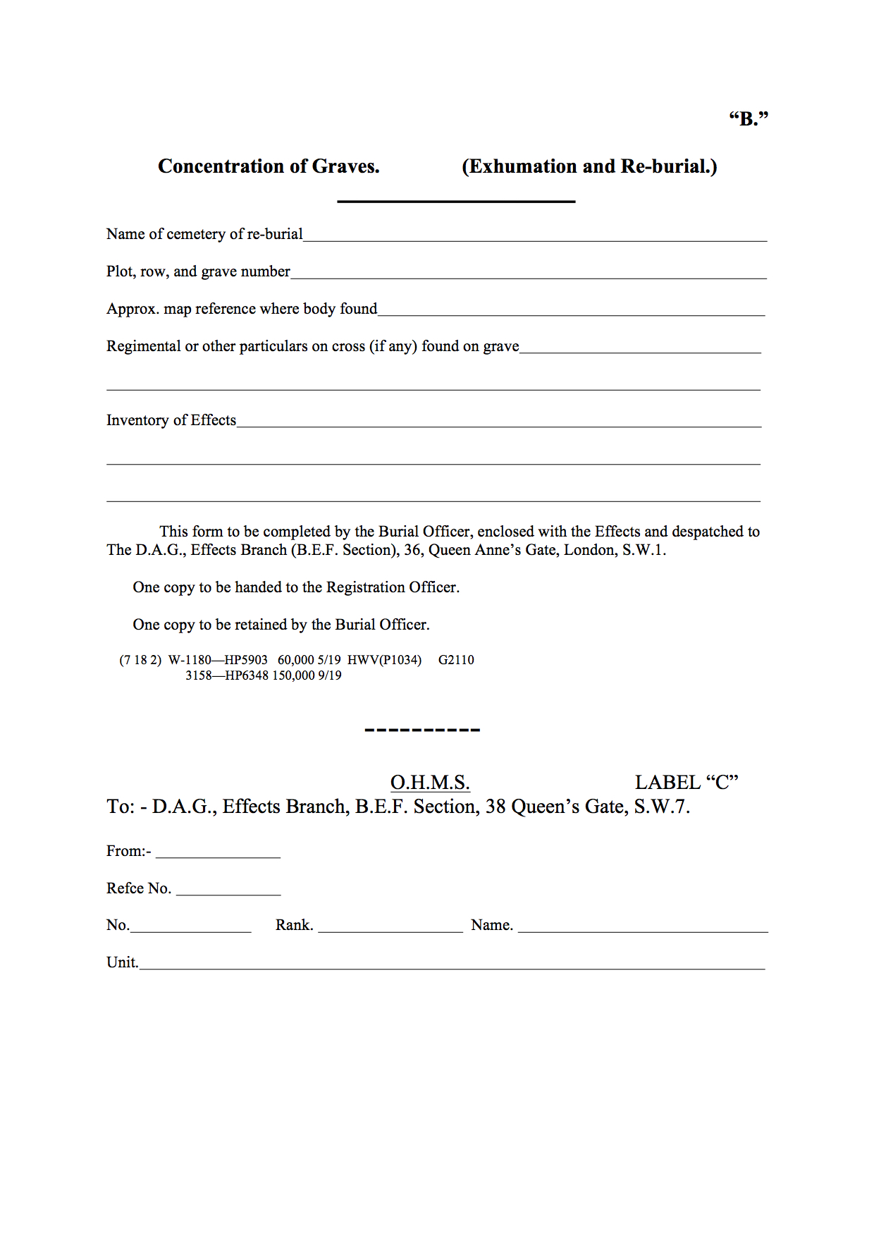 Some early versions of the Concentration of Graves (Exhumation and Re-Burials) form survive such as this example from Lijssenthoek Military Cemetery (printed in France February 1919 by the Army Printing & Stationery Services (A.P. & S.S.)) have “A” printed in the top right hand corner: